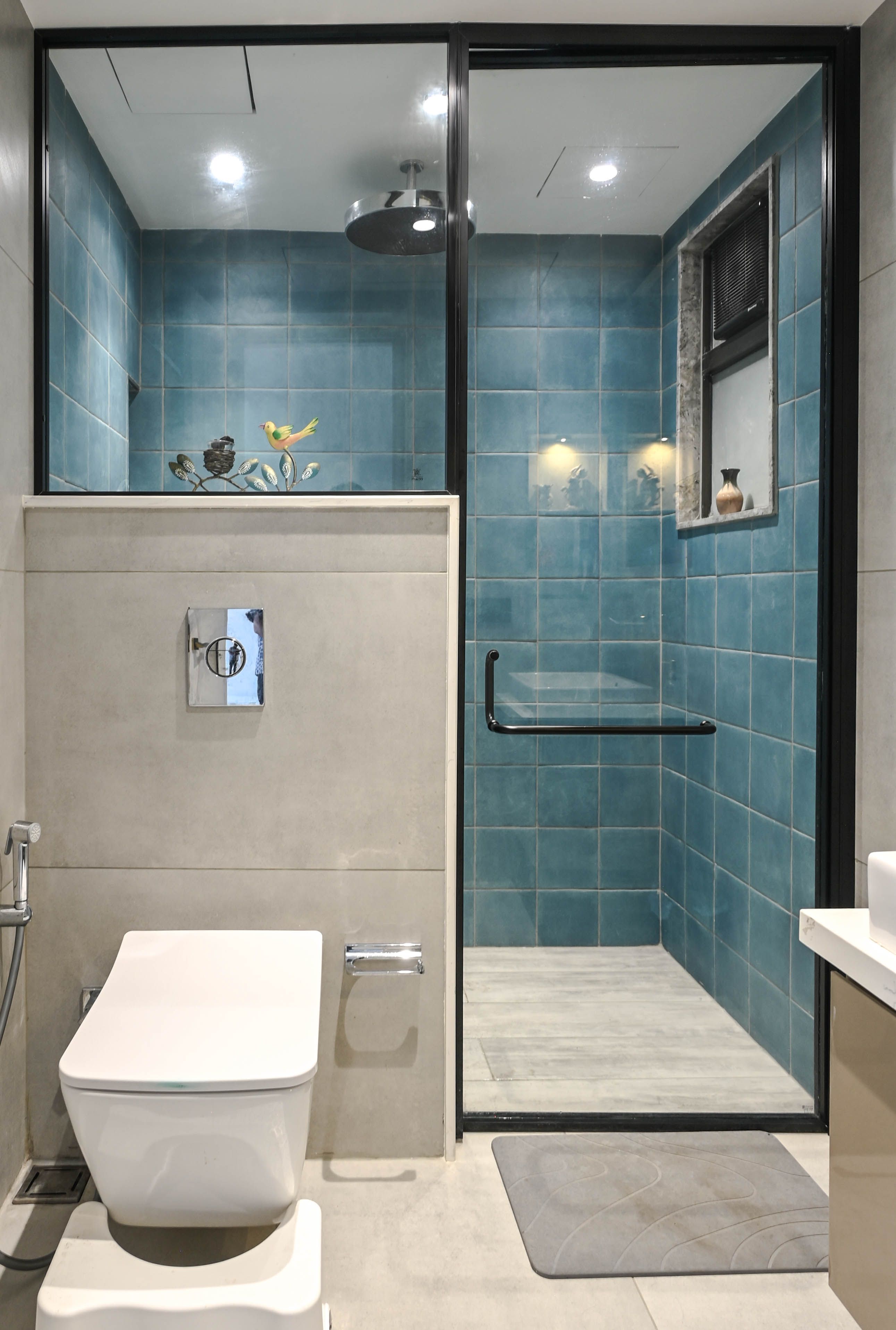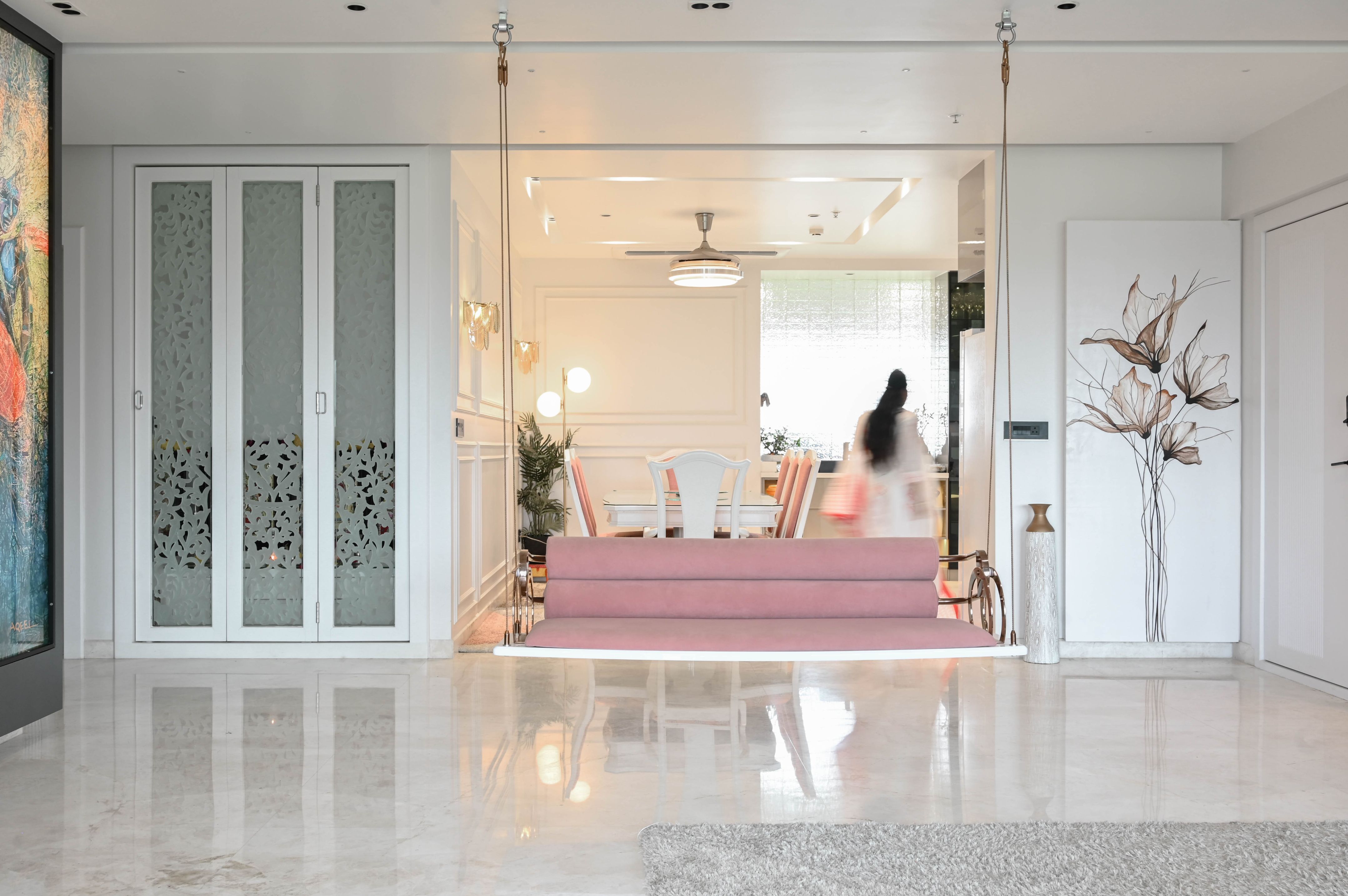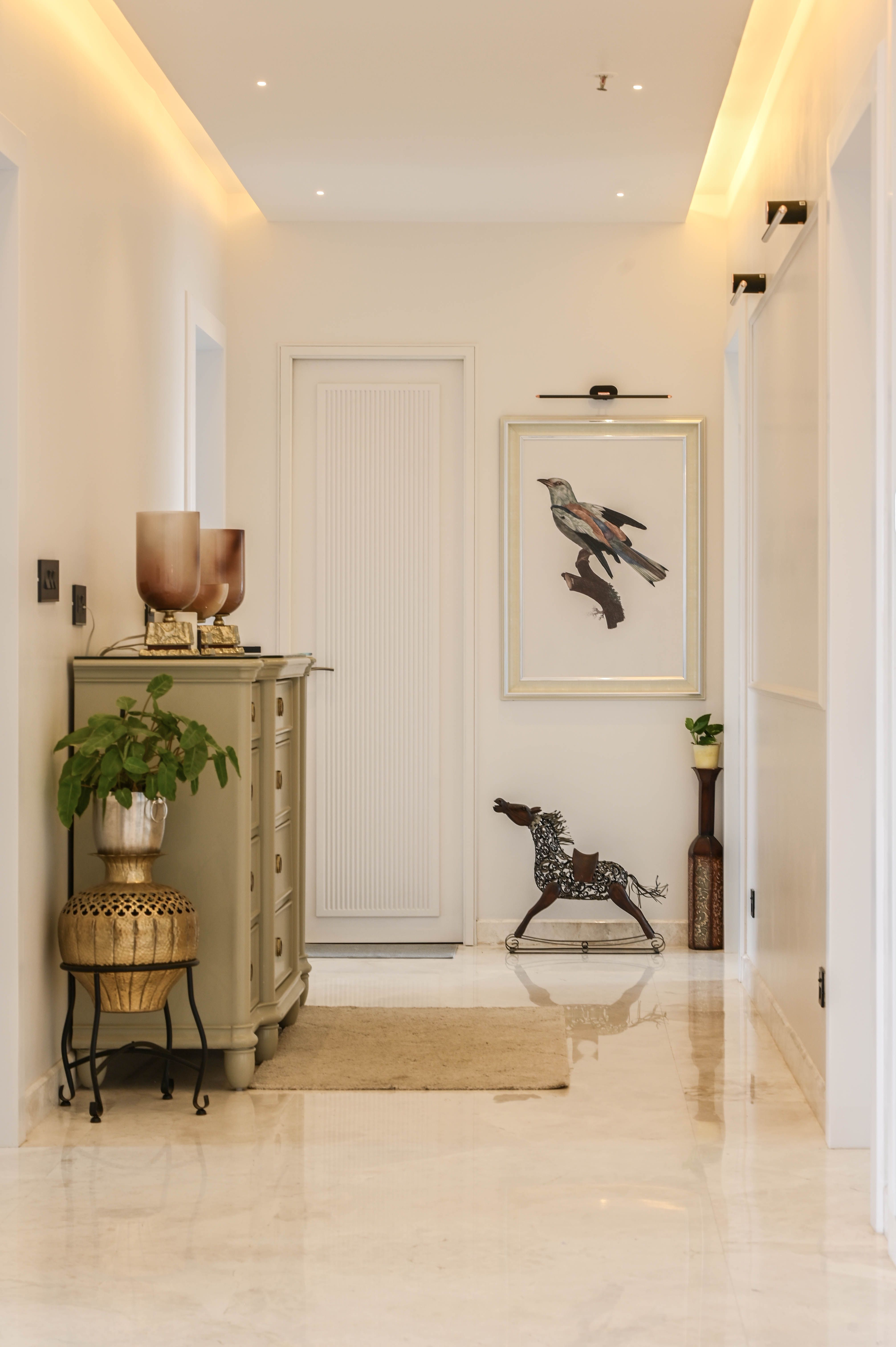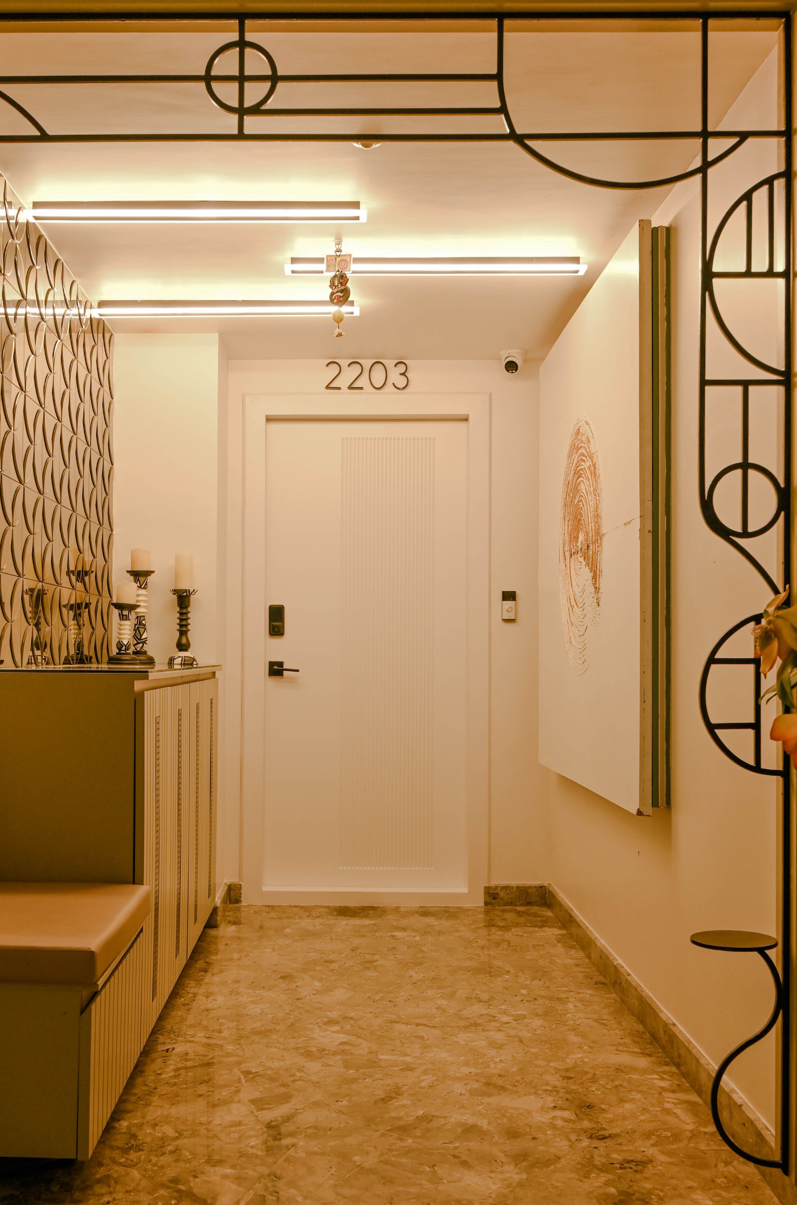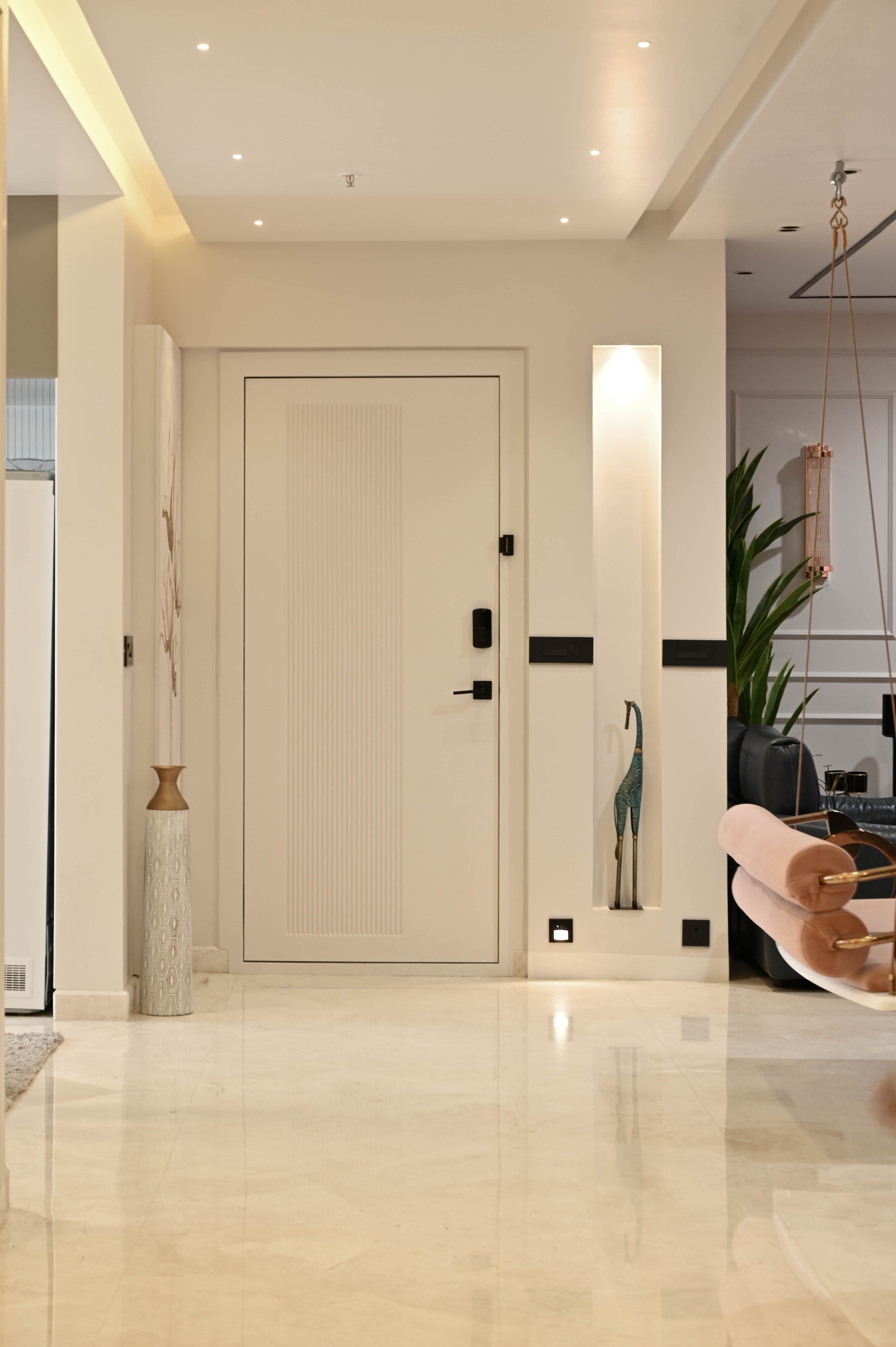The entrance establishes a graceful pause with a bespoke metal arch, a hand-painted panel concealing services, and a perforated metal–wood shoe unit balanced by a statement mirror. In the living area, minimal wall trims and a curated TV unit showcase the family’s travel keepsakes, while wide French windows draw in abundant sunlight.