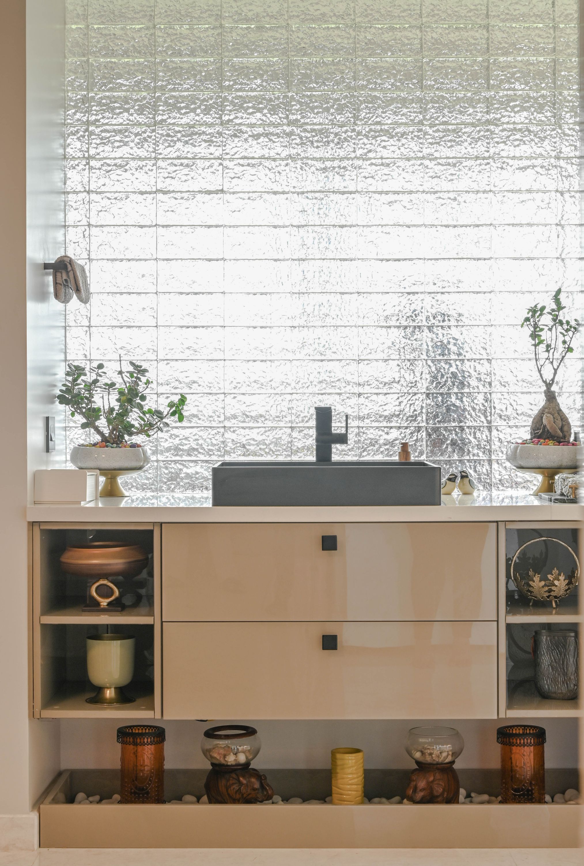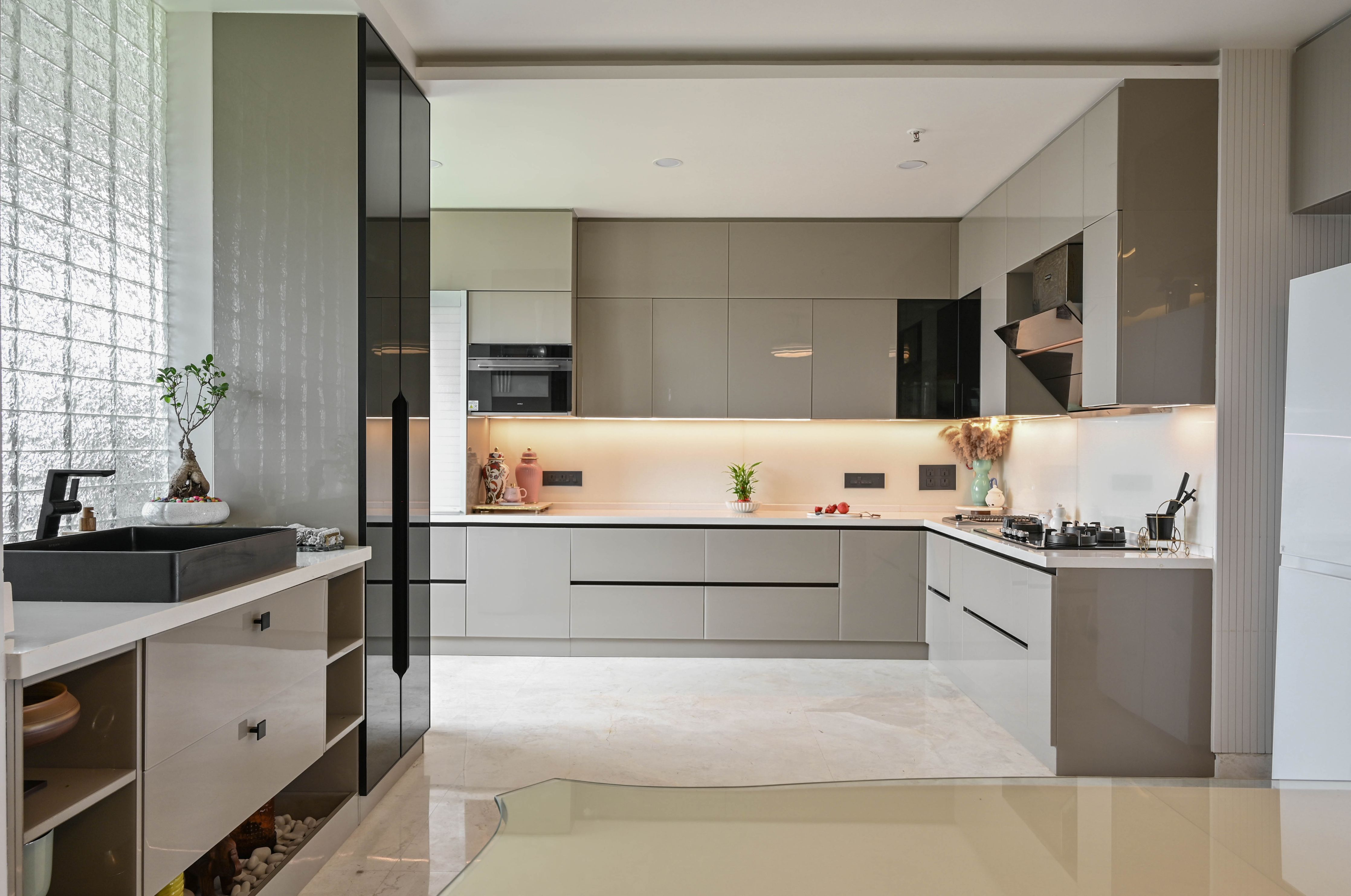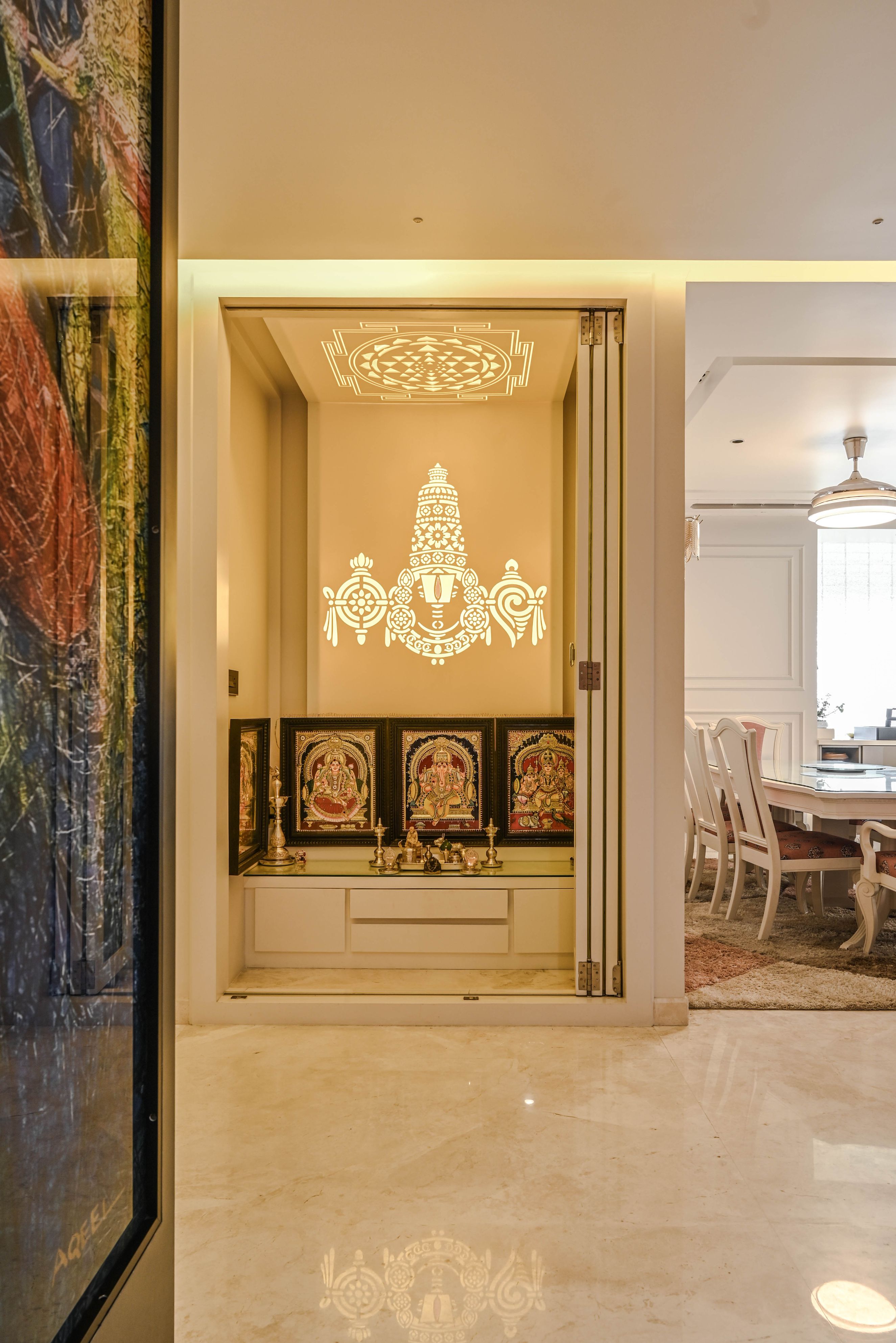 The pooja room becomes a sculptural highlight with a laser-etched tri-fold glass door, an engraved idol of Lord Venkateswara, and a luminous Shree Chakra crafted in acrylic. The dining area continues the refined trim language, complemented by a low partition of textured glass blocks that gently filters natural light. A contemporary kitchen with glass-acrylic shutters and quartz surfaces completes this zone.
