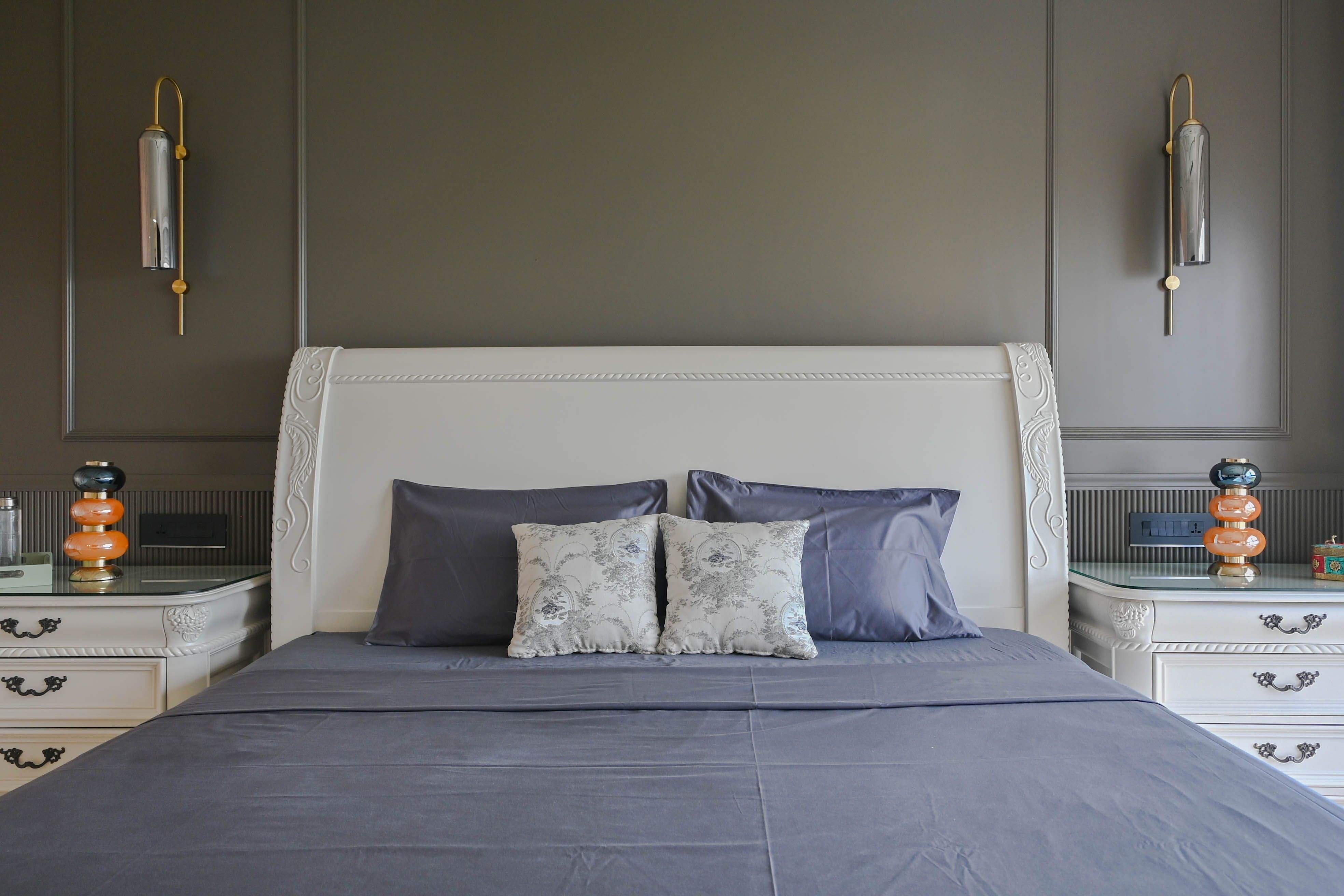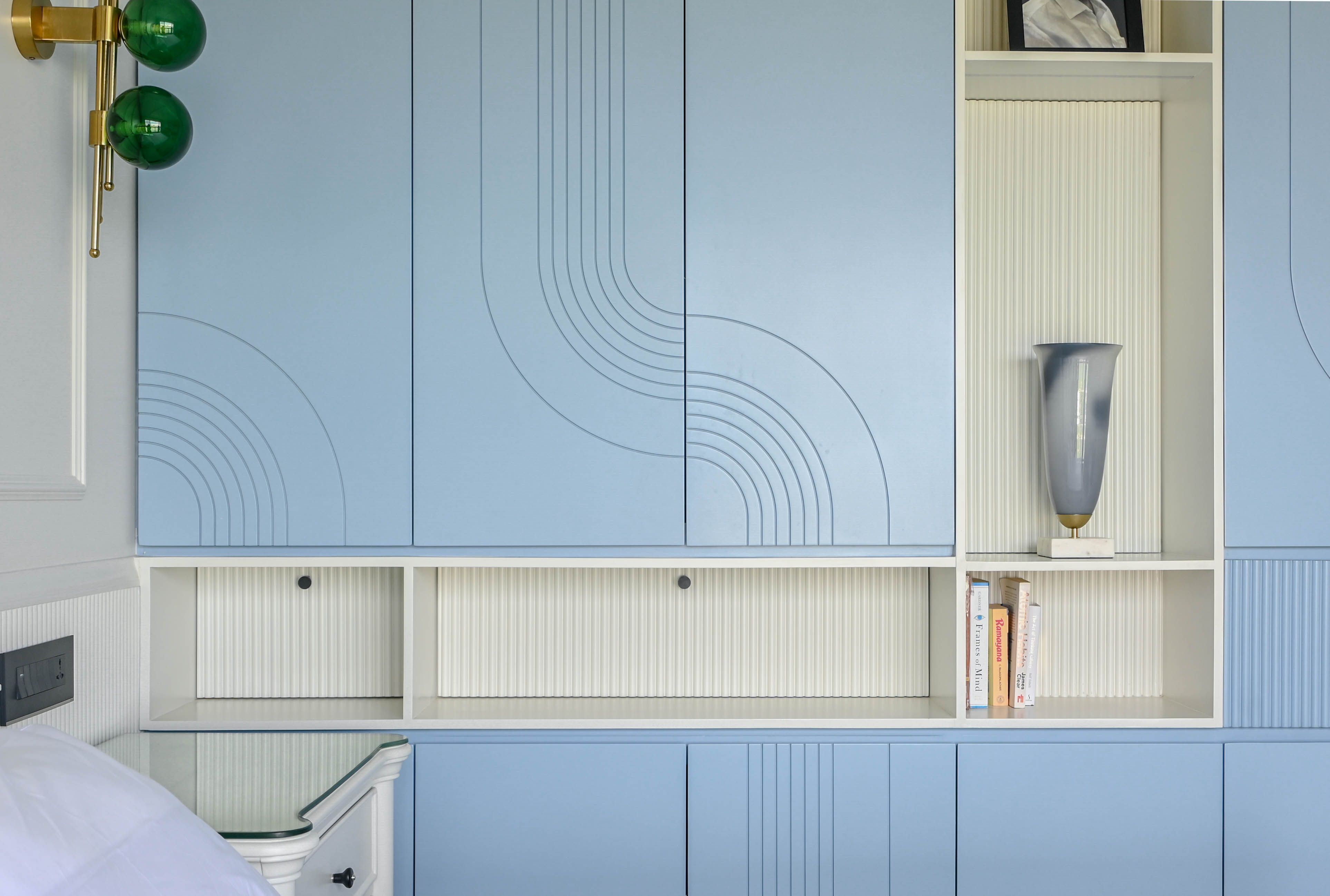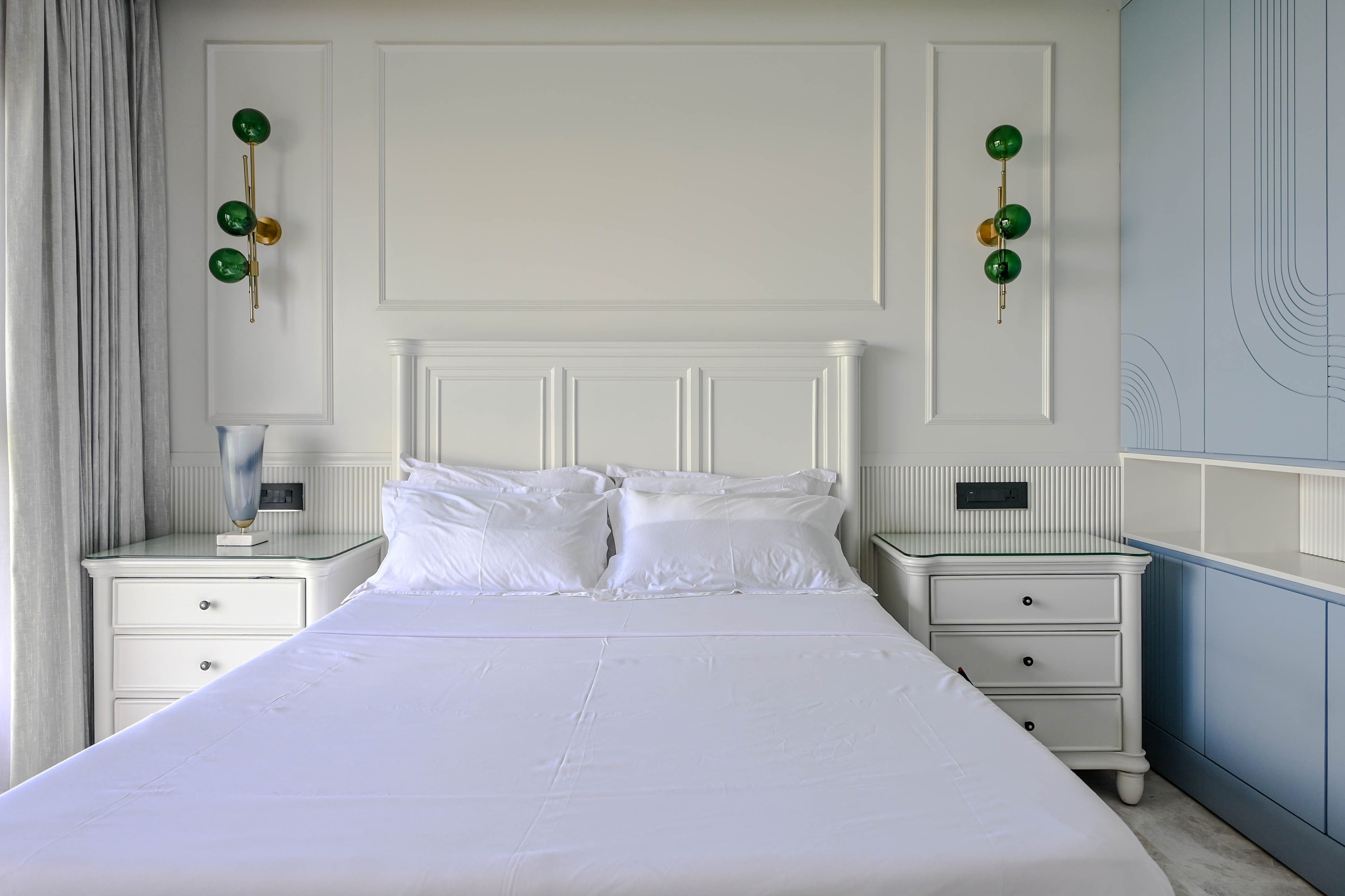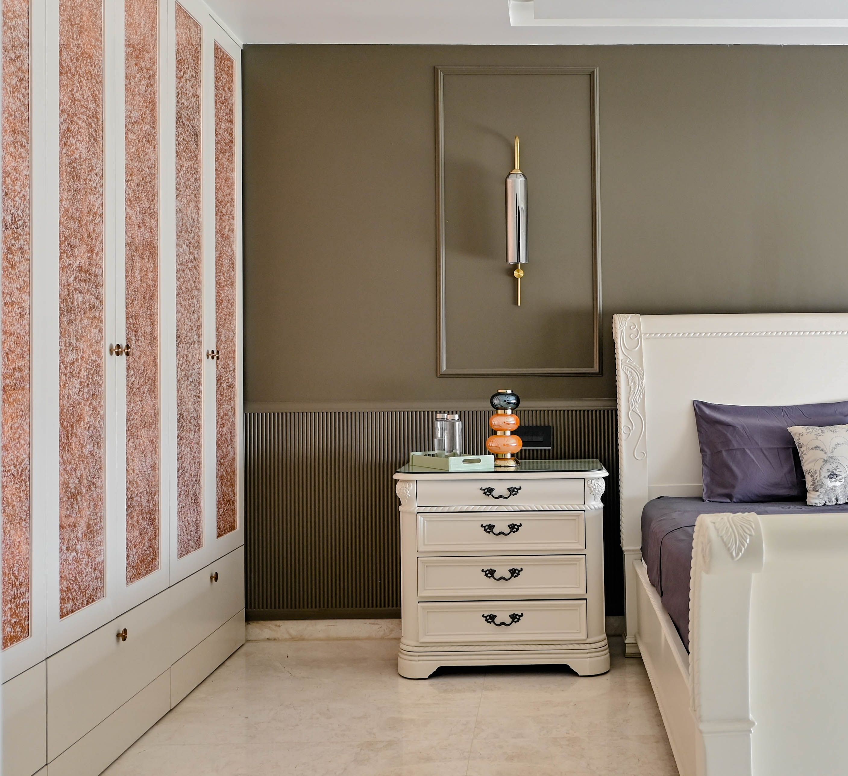 The master bedroom features refurbished heirloom furniture, fluted panelling, and copper-foiled glass wardrobe inserts for a warm yet elegant character. In the kids’ room, trims and fluted wainscoting create playful rhythm and continuity.