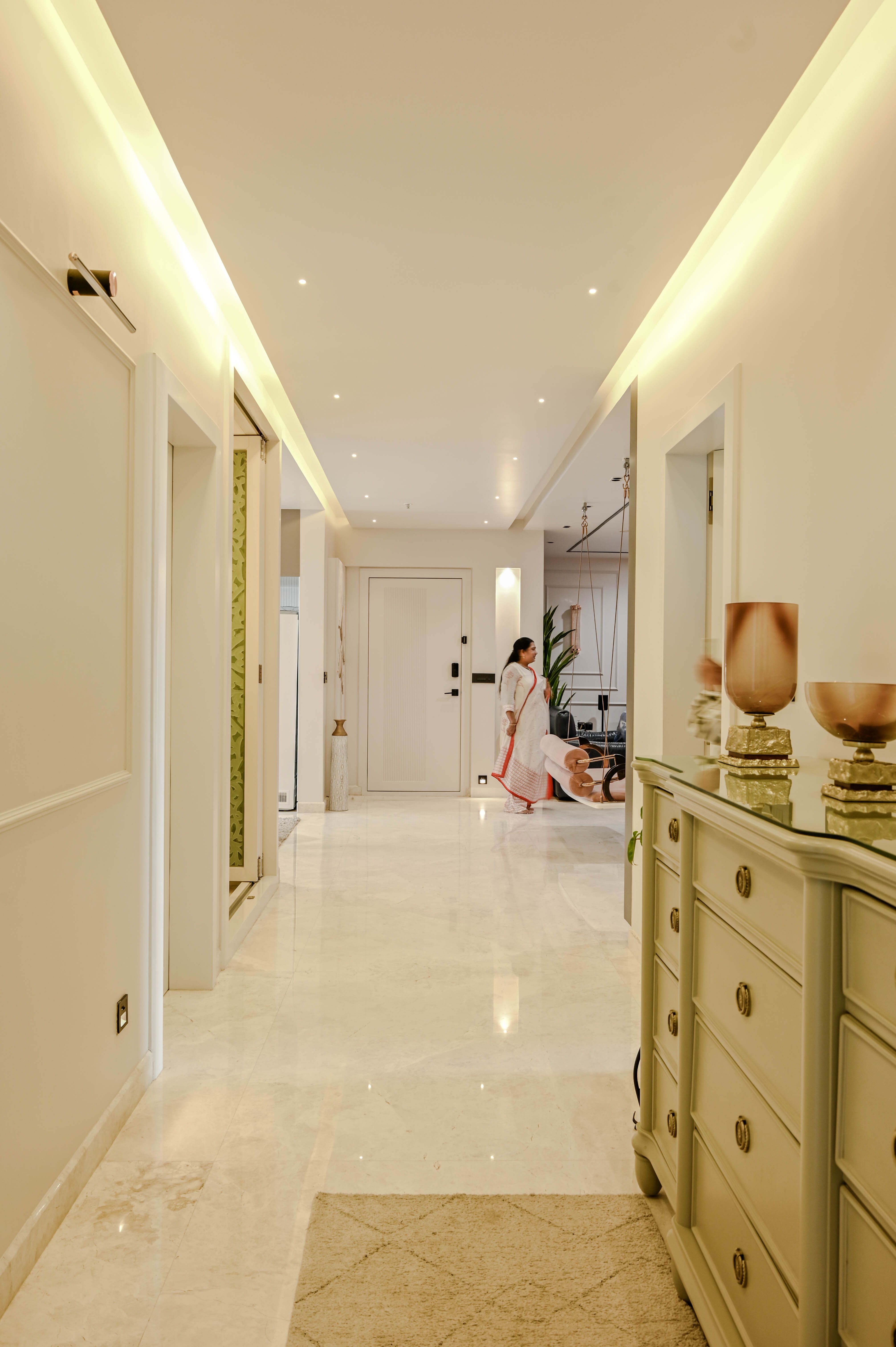 Across the home, marble flooring, matte PU-finished doors, bespoke artwork, and thoughtful lighting — including magnetic track systems and focused spotlights — layer the space with depth and harmony.