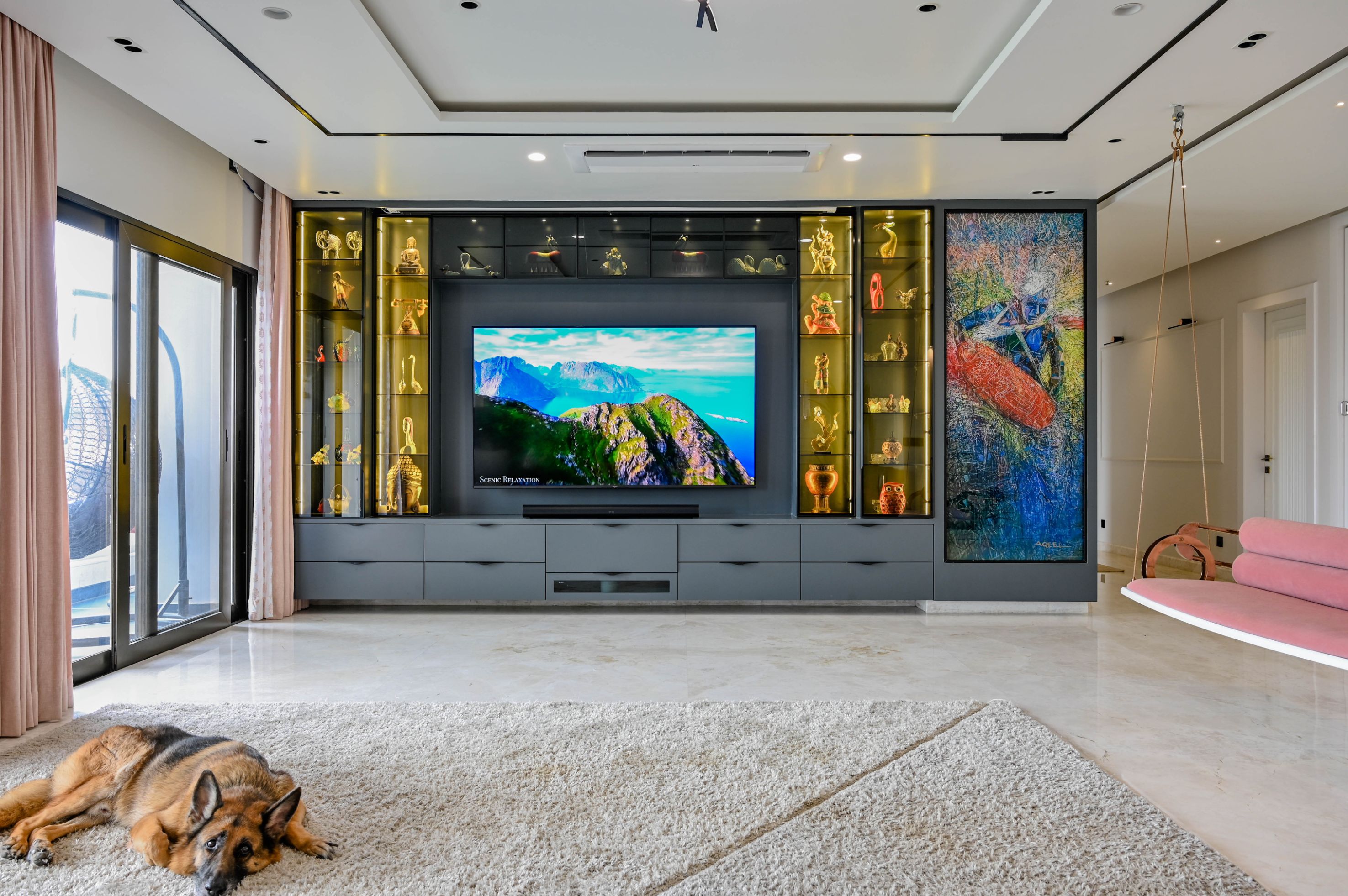 Across the home, marble flooring, matte PU-finished doors, bespoke artwork, and thoughtful lighting — including magnetic track systems and focused spotlights — layer the space with depth and harmony.