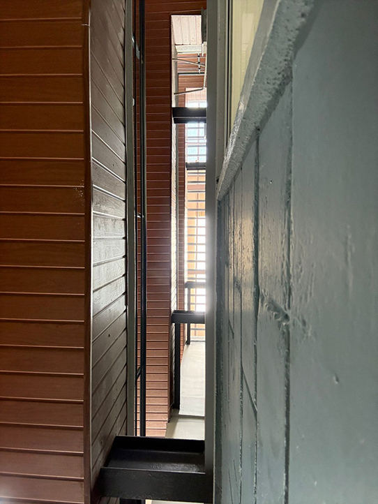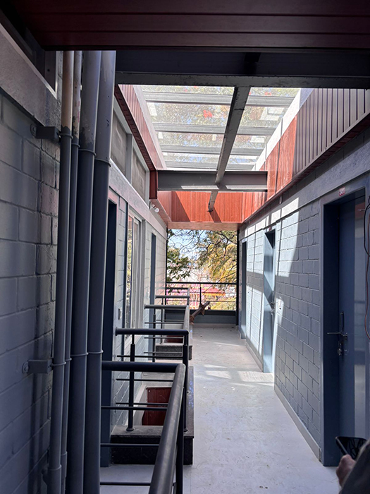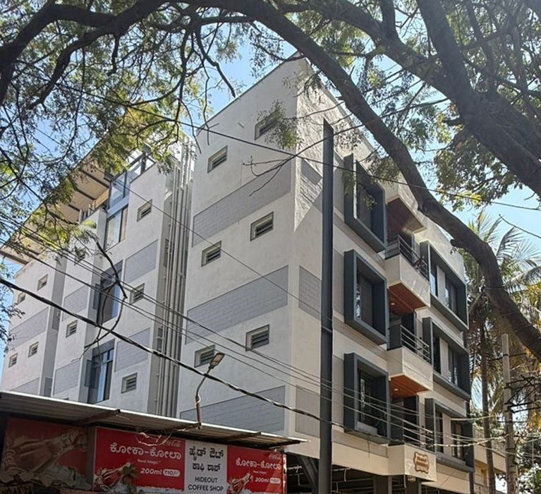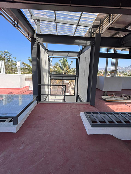 This G+4 PG structure utilizes a steel structure with a grid layout as its foundation. The exposed beams frame the space for the facade design, drawing attention to the structure. Skylights are strategically placed along the passage, illuminating the space and creating an open and inviting atmosphere.