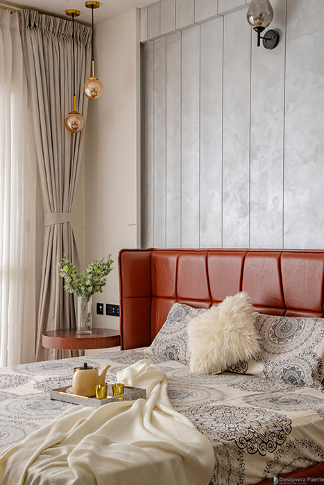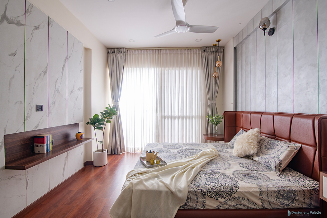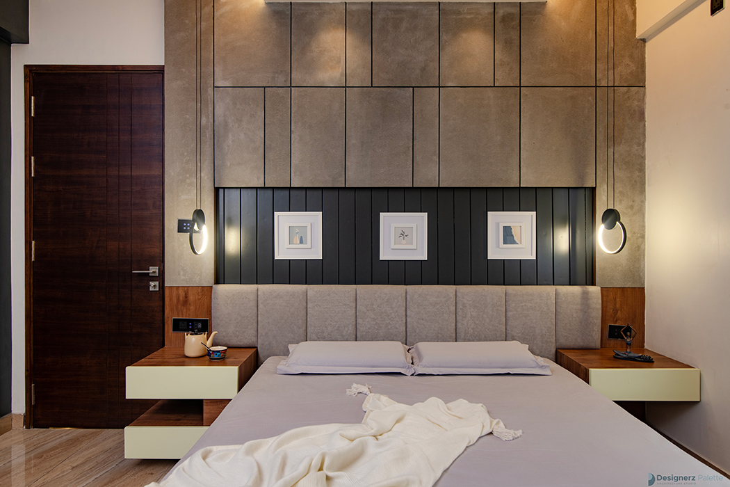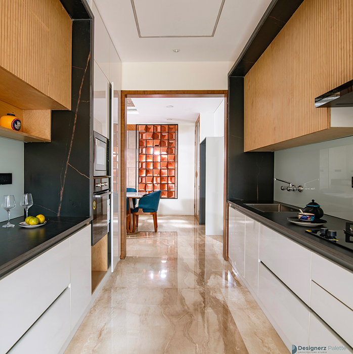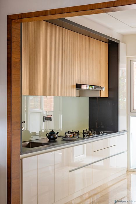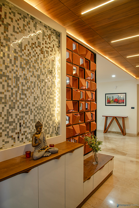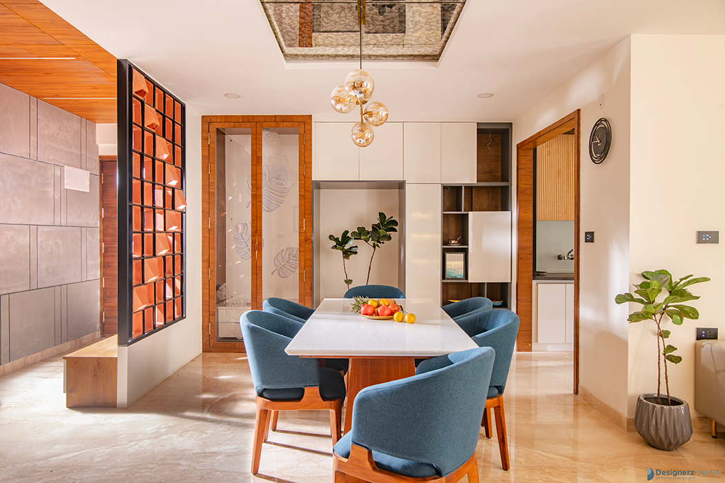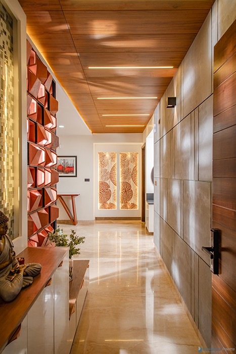 This design of a 3BHK home is a play of lines, as it utilizes varying textural contrasts while maintaining a consistent design line. This is achieved through the use of elements such as a jaali of breeze blocks, grooves on the wooden ceiling, and a neutral color palette with pops of color. The materials are used in unique ways, creating a sense of rhythm and harmony throughout the home, while incorporating the concept of flow into its character. Each room features its own distinct elements, including a pooja space with a back-lit panel of leaves, a guest bedroom with a wardrobe that utilizes the concept of open and closed, and a master bedroom with a laminated wall panel serving as a TV unit ledge.